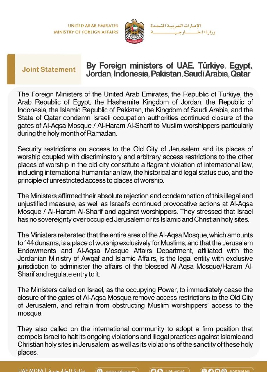 এক যৌথ বিবৃতিতে যুক্ত আরব আমিরাত, তুরস্ক, মিশর, জর্ডান, ইন্দোনেশিয়া, পাকিস্তান, সৌদি আরব এবং কাতার–এর পররাষ্ট্রমন্ত্রীরা বলেন, ইসরায়েলি কর্তৃপক্ষের আল-আকসা মসজিদের ফটক বন্ধ রাখা মুসলিম উপাসনাকারীদের ধর্মীয় অধিকার লঙ্ঘনের শামিল।