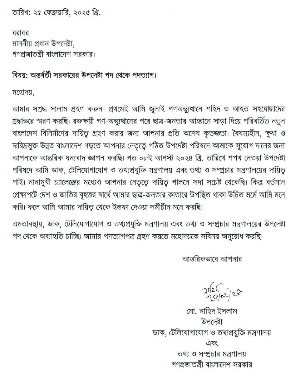 তিনি বলেন, গত ৮ আগস্ট ২০২৪ তারিখে শপথ নেওয়া উপদেষ্টা পরিষদে আমি ডাক, টেলিযোগাযোগ ও তথ্যপ্রযুক্তি মন্ত্রণালয় এবং তথ্য ও সম্প্রচার মন্ত্রণালয়ের দায়িত্ব পাই। নানামুখী চ্যালেঞ্জের মধ্যেও আপনার নেতৃত্বে দায়িত্ব পালনে সদা সচেষ্ট থেকেছি। কিন্তু বর্তমান প্রেক্ষাপটে দেশ ও জাতির বৃহত্তর স্বার্থে আমার ছাত্র-জনতার কাতারে উপস্থিত থাকা উচিত মৰ্মে আমি মনে করি। ফলে আমি আমার দায়িত্ব থেকে ইস্তফা দেওয়া সমীচীন মনে করছি।