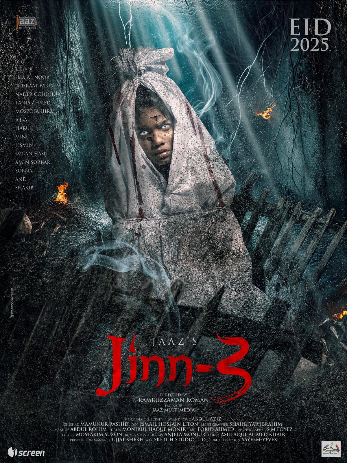 ভৌতিক সিনেমা ‘জ্বীন ৩’ আনছে জাজ মাল্টিমিডিয়া। সংশ্লিষ্টদের দাবি, ‘জ্বীন’ এবং ‘জ্বীন ২’- সফল হয়েছে বিধায় পরের কিস্তি ‘জ্বীন ৩’ আসছে আসন্ন ঈদুল ফিতরে। আর এই সিনেমাটি নির্মিত হচ্ছে একেবারে সত্য ঘটনা অবলম্বনে। ‘জ্বীন ৩’ পরিচালনা করছেন কামরুজ্জামান রোমান। ইতোমধ্যে সিনেমাটির শুটিং সম্পন্ন হয়েছে। বর্তমানে পোস্ট প্রডাকশন চলছে। সোমবার সন্ধ্যায় জাজ মাল্টিমিডিয়ার ভেরিফায়েড পেজে পোস্টারটি প্রকাশ করা হয়। পোস্টারে দেখা যায়, সাদা বস্তায় বন্দি একটি শিশু, যার চোখ সাদা। একেবারে জ্ল জ্ল করছেন। চারপাশে ধোঁয়া ও অন্ধকারের মধ্যে আগুনের আবছা কুন্ডুলি। পোস্টারে উল্লেখ আছে এতে অভিনয় করেছেন নুসরাত ফারিয়া, সজল, নাদের চৌধুরীসহ অনেকে।