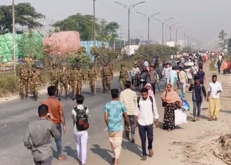 গাজীপুরের চক্রবর্তী ও জিরানী এলাকায় নবীনগর-চন্দ্রা সড়ক অবরোধ করে আজও বিক্ষোভ করছে পোষাক কারখানার শ্রমিকরা।