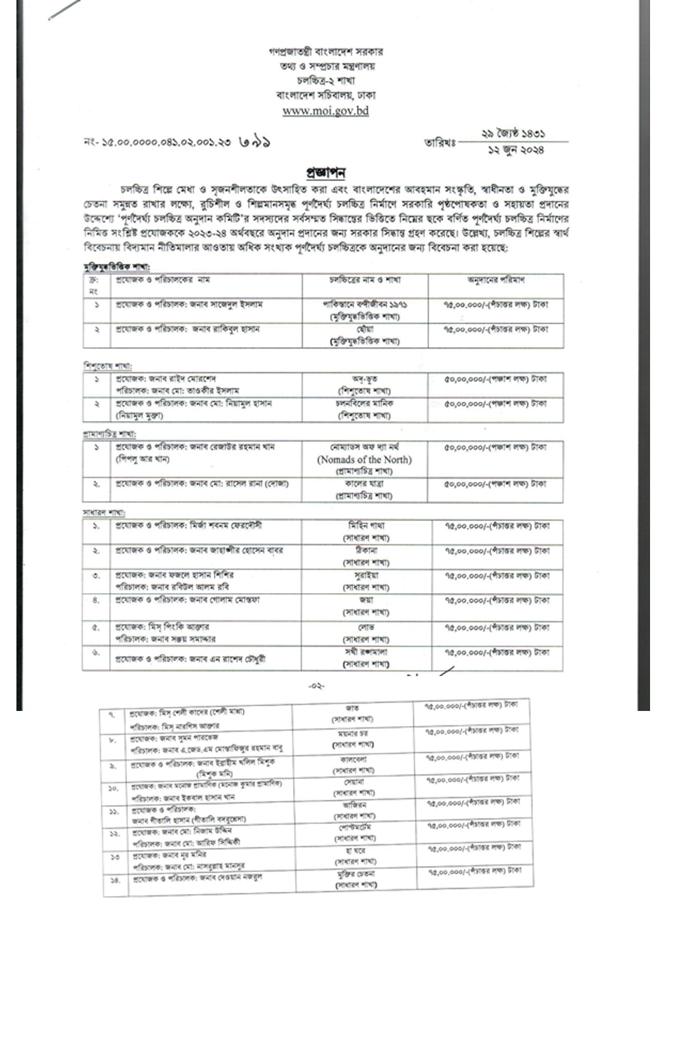 বুধবার (১২ জুন) প্রজ্ঞাপনের মাধ্যমে অনুদানের পরিমাণ ও অনুদান প্রাপ্তদের নামের তালিকা প্রকাশ করা হয়েছে। যেখানে ২০টি পূর্ণদৈর্ঘ্য চলচ্চিত্রের কথা উল্লেখ আছে।