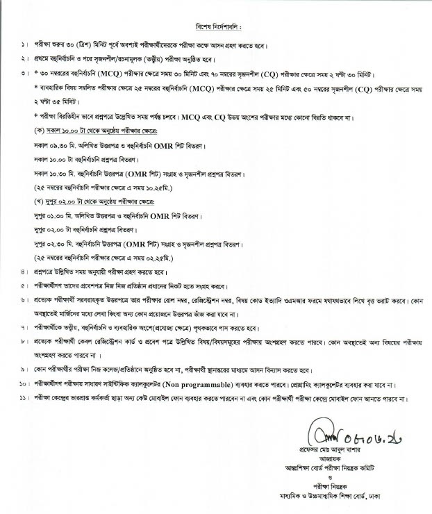 এতে জানানো হয়েছে, পরীক্ষা শুরুর অন্তত ৩০ মিনিট আগে পরীক্ষার্থীদের আসন গ্রহণ করতে হবে। প্রথমে বহু নির্বাচনী ও পরে সৃজনশীল/রচনামূলক (তত্ত্বীয়) পরীক্ষা অনুষ্ঠিত হবে। উভয় অংশের পরীক্ষার মধ্যে কোনো বিরতি থাকবে না।