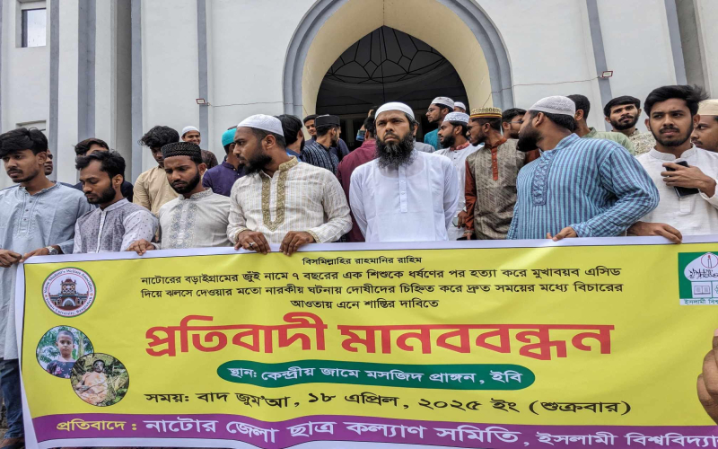 শুক্রবার (১৮ এপ্রিল) বাদ জুম্মা নাটোর জেলা ছাত্রকল্যাণ সমিতির উদ্যোগে কেন্দ্রীয় জামে মসজিদ প্রাঙ্গনে এই বিক্ষোভ ও প্রতিবাদী মানববন্ধন অনুষ্ঠিত হয়। এসময় শাহ আজিজুর রহমান হলের প্রভোস্ট অধ্যাপক ড. এটিএম মিজানুর রহমান, ইবি শিবির সেক্রেটারি মোঃ ইউসুফ আলীসহ নাটোর ছাত্রকল্যাণ সমিতির সদস্যরা উপস্থিত ছিলেন।