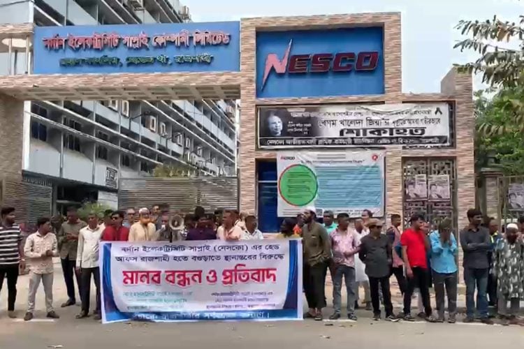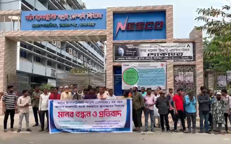 রাজশাহীতে নর্দান ইলেকট্রিসিটি সাপ্লাই কোম্পানি (নেসকো) এর প্রধান কার্যালয় রাজশাহী থেকে বগুড়ায় স্থানান্তরের সিদ্ধান্তের প্রতিবাদে মানববন্ধন কর্মসূচি পালিত হয়েছে।