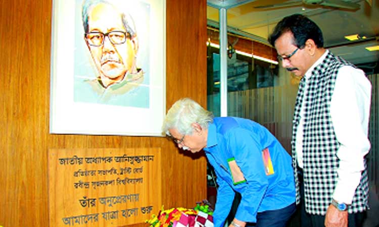 পরিদর্শনকালে রবীন্দ্র সৃজনকলা বিশ্ববিদ্যালয়ের স্বপ্নদ্রষ্টা প্রয়াত জাতীয় অধ্যাপক আনিসুজ্জামানের প্রতিকৃতিতে শ্রদ্ধাজ্ঞাপন করেন ড. মুহম্মদ জাফর ইকবাল।