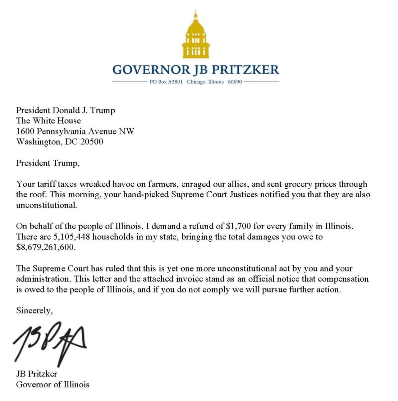 চিঠিতে আরও বলা হয়, সুপ্রিম কোর্ট রায় দিয়েছে যে, এটি ট্রাম্প প্রশাসনের আরেকটি অসাংবিধানিক পদক্ষেপ। প্রিটজকার উল্লেখ করেন, এ চিঠি ও সংযুক্ত বিলকে আনুষ্ঠানিক নোটিশ হিসেবে গণ্য করা হবে এবং ক্ষতিপূরণ পরিশোধ না করা হলে পরবর্তী আইনি পদক্ষেপ নেওয়া হবে।