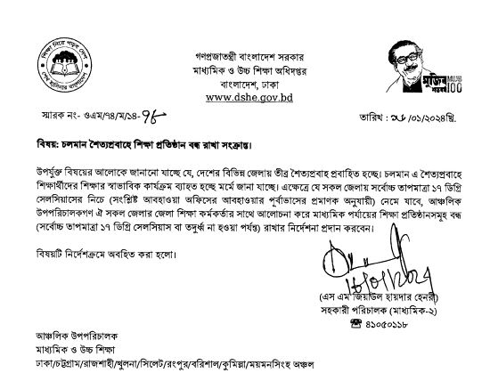সেখানে বলা হয়: উপর্যুক্ত বিষয়ের আলোকে জানানো যাচ্ছে যে, দেশের বিভিন্ন জেলায় তীব্র শৈত্যপ্রবাহ প্রবাহিত হচ্ছে। চলমান এ শৈত্যপ্রবাহ শিক্ষার্থীদের শিক্ষার স্বাভাবিক কার্যক্রম ব্যাহত হচ্ছে মর্মে জানা যাচ্ছে। এক্ষেত্রে যে সকল জেলায় সর্বোচ্চ তাপমাত্রা ১৭ ডিগ্রি সেলসিয়াসের নিচে (সংশ্লিষ্ট আবহাওয়া অফিসের আবহাওয়ার পূর্বাভাসের প্রমাণক অনুযায়ী) নেমে যাবে, আঞ্চলিক উপপরিচালকগণ এ সকল জেলার জেলা শিক্ষা কর্মকর্তার সাথে আলোচনা করে মাধ্যমিক পর্যায়ের শিক্ষা প্রতিষ্ঠানসমূহ বন্ধ (সর্বোচ্চ তাপমাত্রা ১৭ ডিগ্রি সেলসিয়াস বা তদুর্ধ্ব না হওয়া পর্যন্ত) রাখার নির্দেশনা প্রদান করবেন।