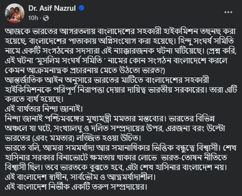 আসিফ নজরুল লিখেছেন, আজ ভারতের আগরতলায় বাংলাদেশের সহকারী হাইকমিশন তছনছ করা হয়েছে, বাংলাদেশের পাতাকায় অগ্নিসংযোগ করা হয়েছে। হিন্দু সংঘর্ষ সমিতি নামে একটি সংগঠনের সদস্যরা এই ন্যক্কারজনক ঘটনা ঘটিয়েছে। (প্রশ্ন করি, এই ঘটনা ‘মুসলিম সংঘর্ষ সমিতি’ নামের কোনো সংগঠন বাংলাদেশে করলে কেমন আক্রমণাত্মক প্রচারণায় মেতে উঠত ভারত?)