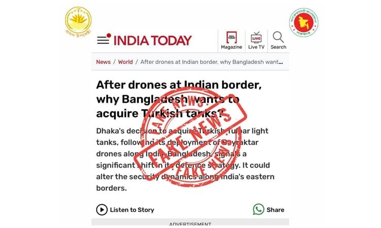 ভারতীয় সংবাদমাধ্যম ‘ইন্ডিয়া টুডে’তে প্রকাশিত ‘ভারতীয় সীমান্তে ড্রোন মোতায়েনের পর, বাংলাদেশ কেন তুর্কি ট্যাংক কিনতে চায়?’ শিরোনামে প্রকাশিত প্রতিবেদনটি ভুয়া বলে দাবি করেছে প্রধান উপদেষ্টার প্রেস উইং।