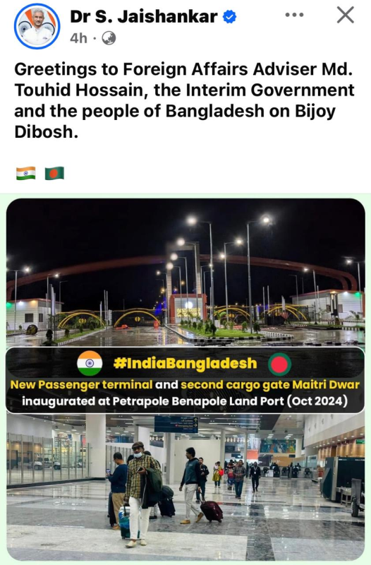 বিজয় দিবস উপলক্ষে পররাষ্ট্র উপদেষ্টা মো: তৌহিদ হোসেন ও বাংলাদেশের জনগণকে শুভেচ্ছা জানিয়েছে ভারতের পররাষ্ট্রমন্ত্রী এস জয়শঙ্কর।