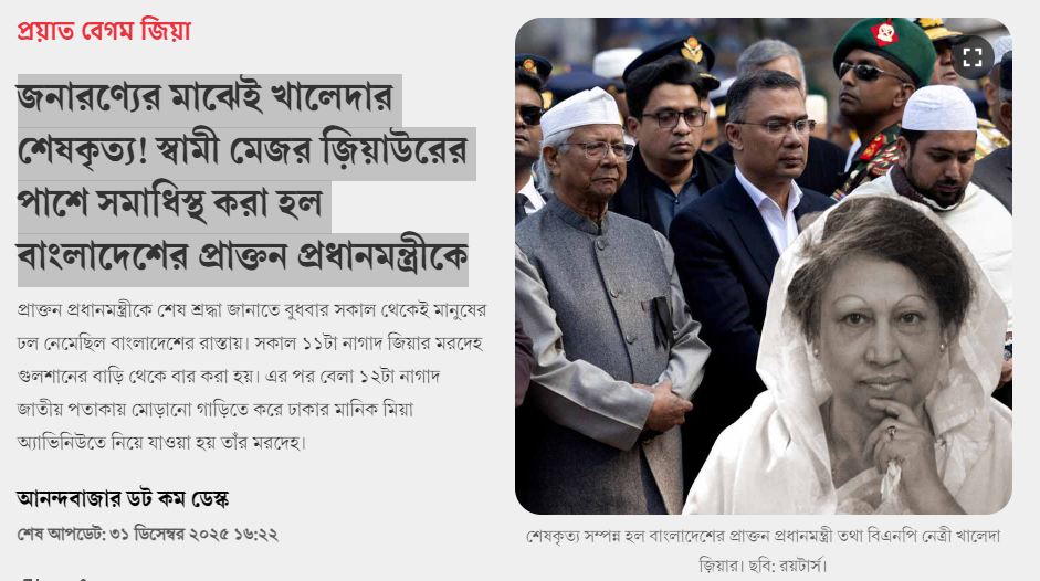অপরদিকে, দেশটির বাংলাভাষাভাষিদের সবচেয়ে জনপ্রিয় সংবাদমাধ্যম আনন্দবাজারের শিরোনাম ছিল: ‘‘জনারণ্যের মাঝেই খালেদার শেষকৃত্য! স্বামী মেজর জ়িয়াউরের পাশে সমাধিস্থ করা হল বাংলাদেশের প্রাক্তন প্রধানমন্ত্রীকে।’’