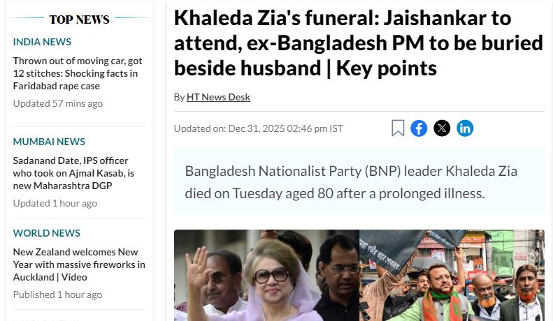 হিন্দুস্তান টাইমসের ট্রেন্ডি ও বিশেষ প্রতিবেদনে লেখা হয়, ‘‘খালেদা জিয়ার শেষকৃত্যে যোগ দিয়েছেন জয়শঙ্কর, স্বামীর পাশে দাফন করা হলো বাংলাদেশের প্রাক্তন প্রধানমন্ত্রীকে।’’