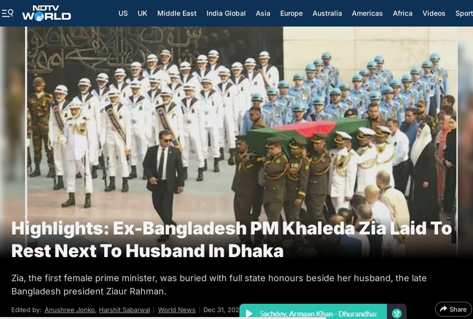 ভারতীয় জনপ্রিয় সংবাদমাধ্যম এনডিটিভির লিড প্রতিবেদনে বলা হয়, ‘‘বাংলাদেশের প্রাক্তন প্রধানমন্ত্রী খালেদা জিয়া ঢাকায় স্বামীর পাশে চিরনিদ্রায় শায়িত।’’