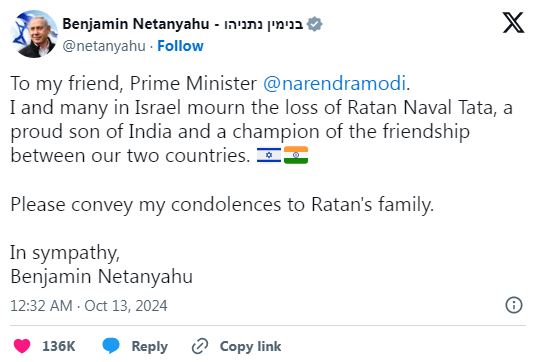 ইসরায়েলের প্রধানমন্ত্রী বেঞ্জামিন নেতানিয়াহু ২০২৪ সালের ১৩ অক্টোবর এক্স পোস্টে ভারতের শিল্পপতি রতন টাটার মৃত্যুতে গভীর শোক প্রকাশ করেছিলেন যা এই সন্দেহকে প্রথমবারের মতো উসকে দেয়। তিনি লিখেছেন, আমার বন্ধু প্রধানমন্ত্রী নরেন্দ্র মোদির প্রতি অনুরোধ, রতন টাটার পরিবারের কাছে আমার সমবেদনা পৌঁছে দিন। তিনি ছিলেন ভারতের এক গর্বিত সন্তান এবং আমাদের দুই দেশের বন্ধুত্বের এক দৃঢ় সেতুবন্ধন।