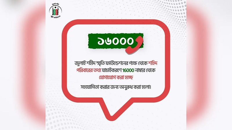 বিজ্ঞপ্তিতে বলা হয়, জুলাই শহীদ স্মৃতি ফাউন্ডেশনের পক্ষ থেকে ছাত্র জনতার গণঅভ্যুত্থানে শহীদ পরিবারের তথ্য যাচাই করার জন্য ১৬০০০ নাম্বার থেকে যোগাযোগ করা হচ্ছে।