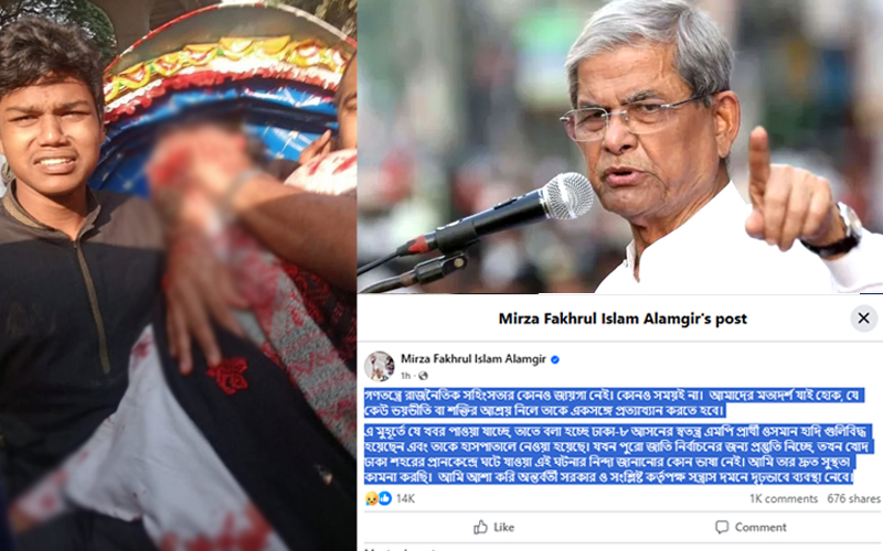 ঢাকা-৮ আসনের সম্ভাব্য স্বতন্ত্র প্রার্থী ও ইনকিলাব মঞ্চের মুখপাত্র শরিফ ওসমান হাদি গুলিবিদ্ধ হয়ে হাসপাতালে চিকিৎসাধীন। তার দ্রুত সুস্থতা কামনা করে বিএনপির মহাসচিব মির্জা ফখরুল ইসলাম আলমগীর বলেছেন, আশা করি অন্তর্বর্তী সরকার ও সংশ্লিষ্ট কর্তৃপক্ষ দ্রুত দৃঢ়ভাবে ব্যবস্থা নেবে।
