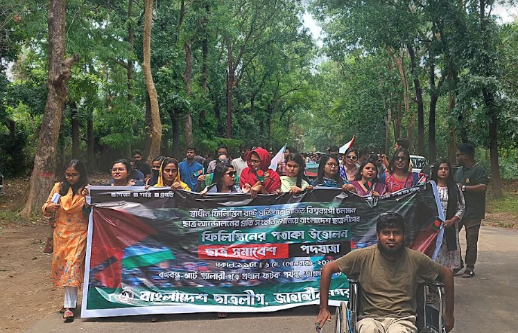 স্বাধীন ফিলিস্তিন রাষ্ট্র প্রতিষ্ঠার দাবিতে পদযাত্রা কর্মসূচি পালন করেছে জাহাঙ্গীরনগর বিশ্ববিদ্যালয় (জাবি) শাখা ছাত্রলীগের নেতাকর্মীরা।