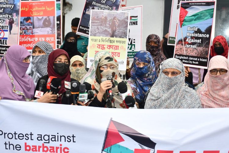 ঢাকা মহানগরী দক্ষিণের মহিলা বিভাগের সহকারী সেক্রেটারী জান্নাতুল কারীম সুইটি বলেন, কোন সভ্য জাতি গণহত্যা চালাতে পারে না। ইসরায়েলি গোষ্ঠী পৃথিবীর ইতিহাসে এক অসভ্য সন্ত্রাসী গোষ্ঠী। তিনি অন্তবর্তীকালীন সরকারের উদ্দেশ্যে বলেন, বাংলাদেশের জনগণের পক্ষে ইসরায়েলের উপর নিষেধাজ্ঞা আরোপ করতে জাতিসংঘের কাছে দাবি জানাতে হবে।