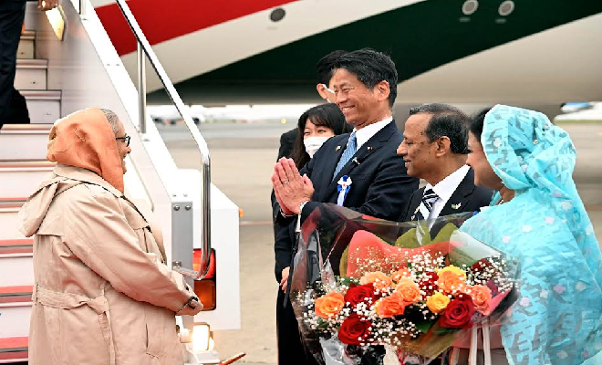 বাসস জানায়, প্রধানমন্ত্রী ও তার সফরসঙ্গীদের বহনকারী বিমান বাংলাদেশ এয়ারলাইন্সের ভিভিআইপি চাটার্ড ফ্লাইট (বিজি১৪০৩) আজ জাপানের স্থানীয় সময় বিকেল ৪টা ৪৫ মিনিটে টোকিও’র হানেদা আন্তর্জাতিক বিমানবন্দরে অবতরণ করে।