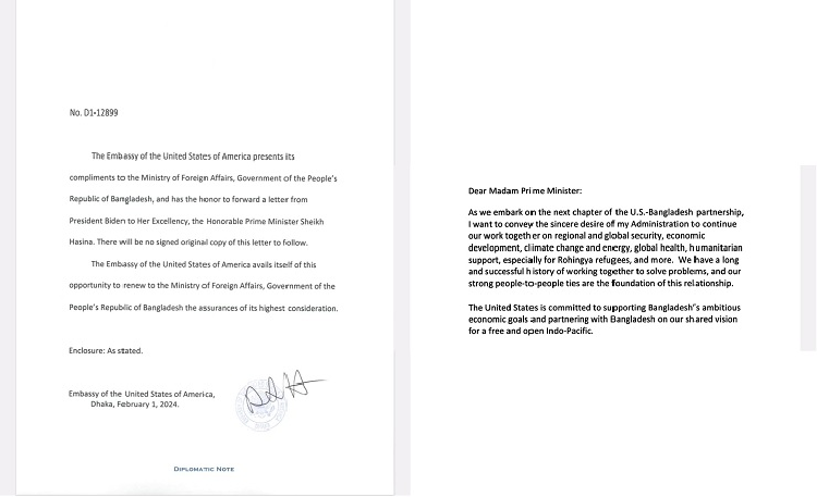 বাংলাদেশের অর্থনৈতিক লক্ষ্য অর্জনে একসঙ্গে কাজ করার ইচ্ছা প্রকাশ করে প্রধানমন্ত্রী শেখ হাসিনাকে চিঠি দিয়েছেন যুক্তরাষ্ট্রের প্রেসিডেন্ট জো বাইডেন।