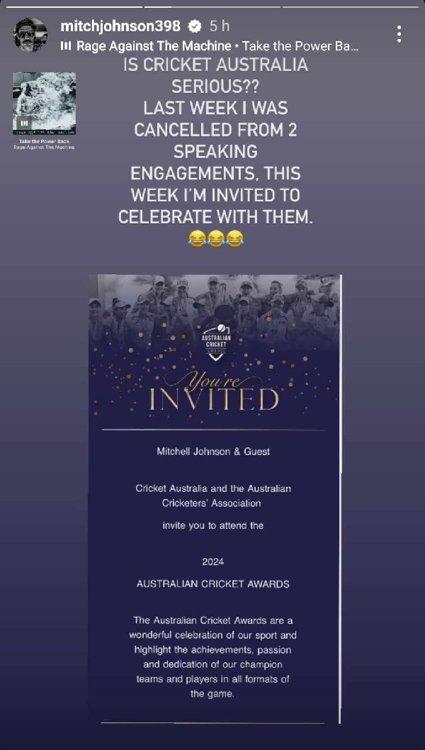 ইন্সটাগ্রামে পুরস্কার গ্রহণের আমন্ত্রণের স্কিনশট দিয়ে জনসন লিখেছেন, ‘ক্রিকেট অস্ট্রেলিয়া কি সিরিয়াস? গত সপ্তাহে দুই দিনের ধারাভাষ্য থেকে আমাকে সরিয়ে দেয়া হয়েছিল। এই সপ্তাহে তাদের সঙ্গে পুরস্কার উদযাপনের জন্য আমাকে আমন্ত্রণ জানিয়েছে।’