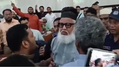 তবে আয়োজকদের দাবি, ঢাকার কোনো আদালতের নির্দেশনা তারা পাননি। এ নিয়ে উভয়পক্ষের মধ্যে তর্ক-বিতর্ক শুরু হলে পরিস্থিতি উত্তপ্ত হয়ে ওঠে। ভাইরাল হওয়া ভিডিওতে দেখা যায়, বিচারপতি ও অন্যান্য সদস্যদের মধ্যে বাকবিতণ্ডা চলছে এবং একপর্যায়ে ‘ভুয়া ভুয়া’ স্লোগানও শোনা যায়। পরিস্থিতি নিয়ন্ত্রণের বাইরে চলে গেলে বিচারপতির নিরাপত্তায় থাকা পুলিশ সদস্যরা তাকে ঘিরে রাখেন এবং পরে তিনি অনুষ্ঠানস্থল ত্যাগ করেন।