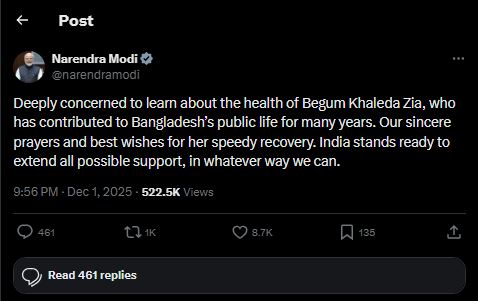 পোস্টে মোদি লিখেছেন, ‘বেগম খালেদা জিয়ার অসুস্থতার খবরে গভীরভাবে উদ্বিগ্ন তিনি। তার দ্রুত আরোগ্যের জন্য আমাদের আন্তরিক প্রার্থনা এবং শুভ কামনা। আমরা যেভাবে পারি, আমাদের পক্ষ থেকে সম্ভাব্য সকল ধরণের সহায়তা প্রদানের জন্য ভারত প্রস্তুত।’