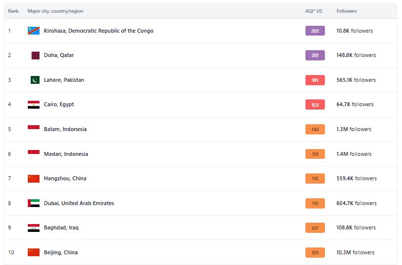 তালিকায় দ্বিতীয় স্থানে রয়েছে কাতারের রাজধানী দোহা (স্কোর ২০১), তৃতীয় স্থানে পাকিস্তানের লাহোর (১৮১), চতুর্থ স্থানে মিশরের কায়রো (১৫৩) এবং পঞ্চম স্থানে ইন্দোনেশিয়ার বাতাম (১৪০)।