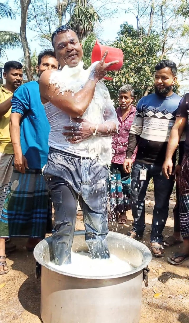 ৪০ লিটার দুধ দিয়ে গোসল করে অনলাইন জুয়া খেলা ছাড়ার ঘোষণা দিয়েছেন কোটালীপাড়া উপজেলার এক যুবক। তিনি হলেন কোটালীপাড়া পৌরসভার ঘাঘরকান্দা গ্রামের রাশেদ দাড়িয়া (৩৫), পিতা হাচেন দাড়িয়া।