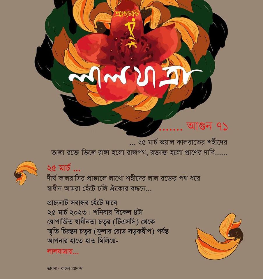 লাল যাত্রার ভাবনা যার মাথা থেকে, সেই রাহুল আনন্দ জানিয়েছেন, ২৫ মার্চ ভয়াল কালরাতের শহীদের তাজা রক্তে ভিজে রাঙা হলো পলাশ, শিমুল – হরেক রঙের ফুল। দীর্ঘ কালরাত্রির প্রাক্কালে আমাদের পূর্বপুরুষের লাল রক্তের পথ ধরে- স্বাধীন আমরা হেঁটে চলি ঐক্যের বন্ধনে, লালযাত্রায়…।