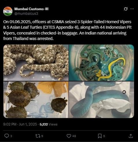 আজ (২ জুন) সোমবার প্রকাশিত একটি প্রতিবেদনে জিও নিউজ জানিয়েছে, ওই যাত্রীর লাগেজ থেকে ৪৪টি ইন্দোনেশিয়ান পিট ভাইপার, তিনটি স্পাইডার-টেইলড হর্ণড ভাইপার এবং পাঁচটি এশিয়ান লিফ টার্টল উদ্ধার করা হয়েছে বলে নিশ্চিত করেছে মুম্বাই কাস্টমস। এই সাপগুলো চেক-ইন লাগেজে লুকানো ছিল বলে জানিয়েছে কাস্টমস।