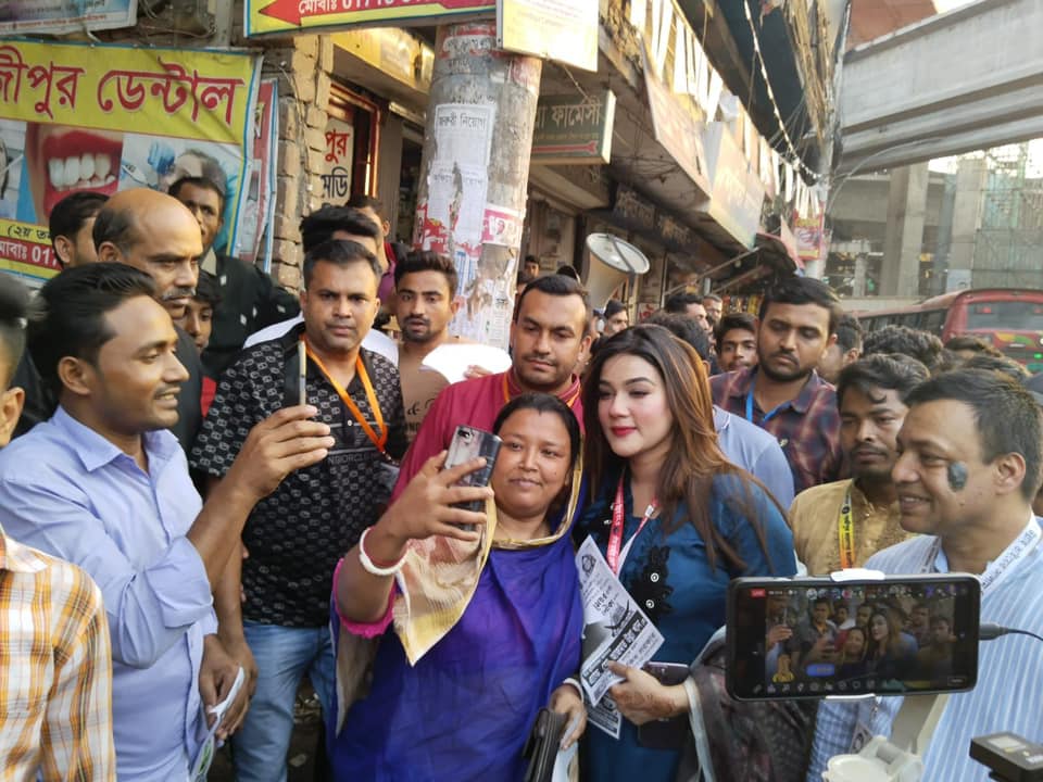শনিবার (২০ মে) বাংলা সিনেমার এই অগ্নিকন্যা গাজীপুর মহানগরের চান্দনা চৌরাস্তা এলাকার আশপাশের ভোটারদের কাছে নৌকার প্রার্থী অ্যাড. আজমত উল্লার জন্য ভোট চান ও লিফলেট বিতরণ করেন। এ সময় মাহির স্বামী রকিব সরকার তার সঙ্গে ছিলেন।