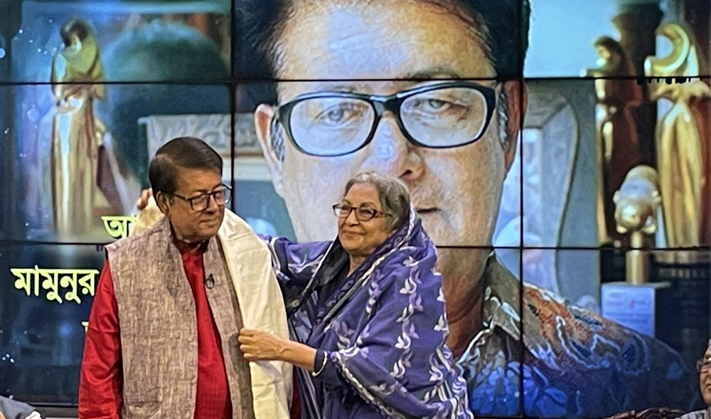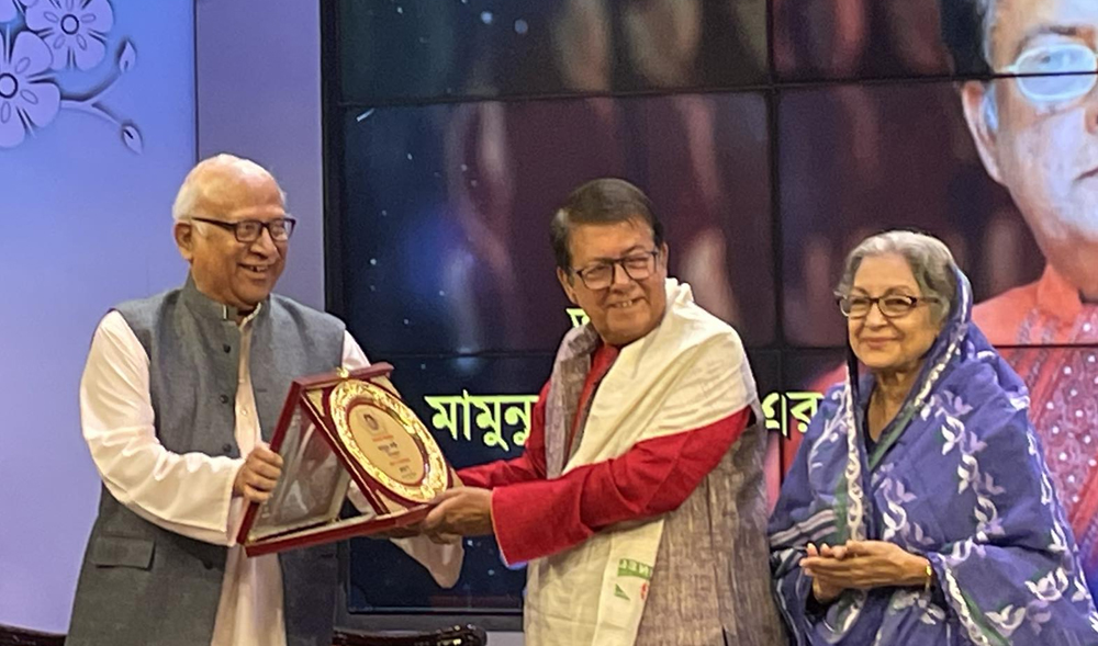 এরপর মামুনুর রশীদকে উত্তরীয় পরিয়ে দেন গুণী অভিনেত্রী দিলারা জামান। তার হাতে ক্রেস্ট তুলে দেন মঞ্চ সারথী আতাউর রহমান। তারপর নাটকের মঙ্গল কামনা করে তার হাতে তুলে দেয়া হয় দুই লক্ষ টাকার অর্থ পুরস্কার। এসময়ে ফরিদুর রেজা সাগর বলেন, ‘এটা মামুন ভাইয়ের জন্য নয়, নাটকের জন্য।’