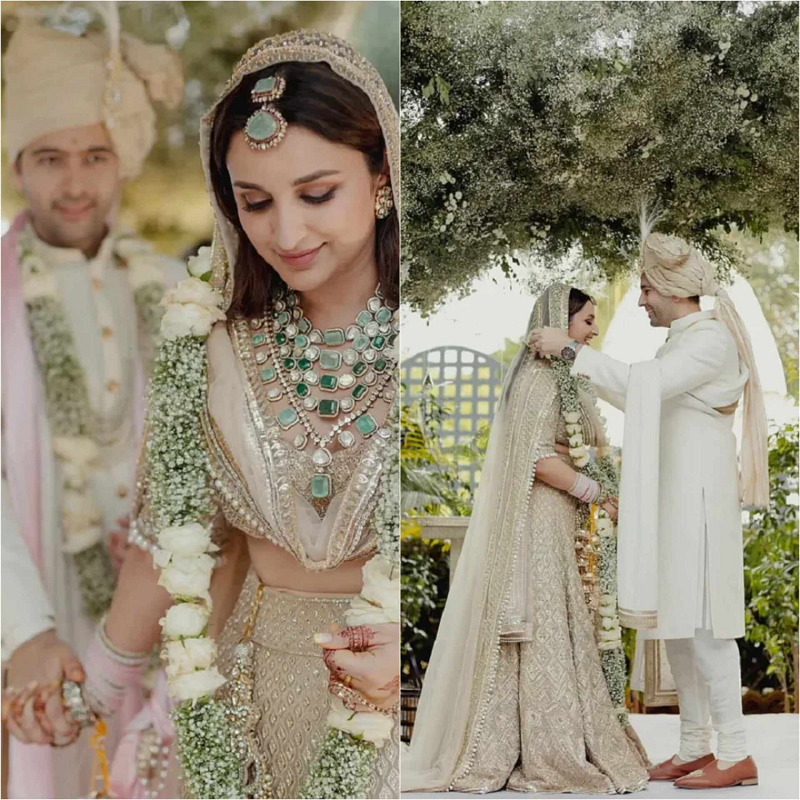 জীবনের বিশেষ এই দিনে বাদামি রঙের লেহেঙ্গায় সেজেছিলেন পরিণীতি। গলায় ছিল সবুজ, প্যাস্টাল ও সাদা পাথরের অপূর্ব নেকলেস। আর রাঘবের পরনে অফ হোয়াইট রংয়ের শেরওয়ানি। তবে পরিণীতির বিয়ের পোশাকের সবচেয়ে আকর্ষনীয় অংশ ছিল তার বিয়ের ওড়নাতে। এটা যেমন দারুণভাবে সাজানো ছিল, তেমনি ওড়নার পেছনে কিছু লেখা ছিল, সেটা অবশ্য কাছ থেকে বুঝতে আর সমস্যা হয়নি। তার ওড়নায় রাঘবের নাম লেখা ছিল।