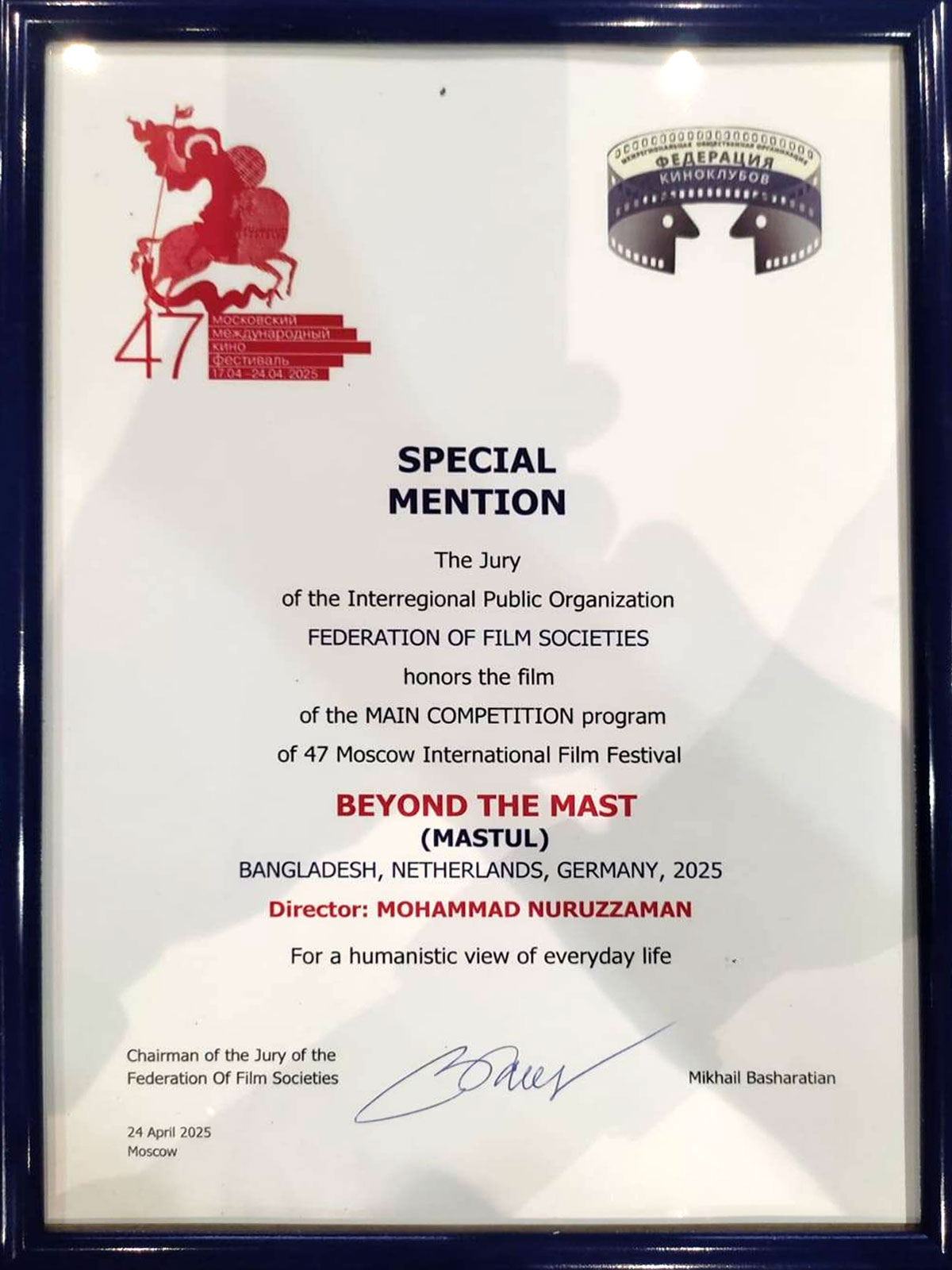 বৃহস্পতিবার (২৪ এপ্রিল) স্থানীয় সময় রাত সোয়া ৮টায় বসছে মস্কো আন্তর্জাতিক চলচ্চিত্র উৎসবের ৪৭তম আসরের সমাপনী অনুষ্ঠান। তারআগে সকালে হয়ে গেল ‘ফার্স্ট প্রাইজ’ সেরেমনি। যেখানে স্পেশাল মেনশন এওয়ার্ড জিতলো ‘মাস্তুল’।