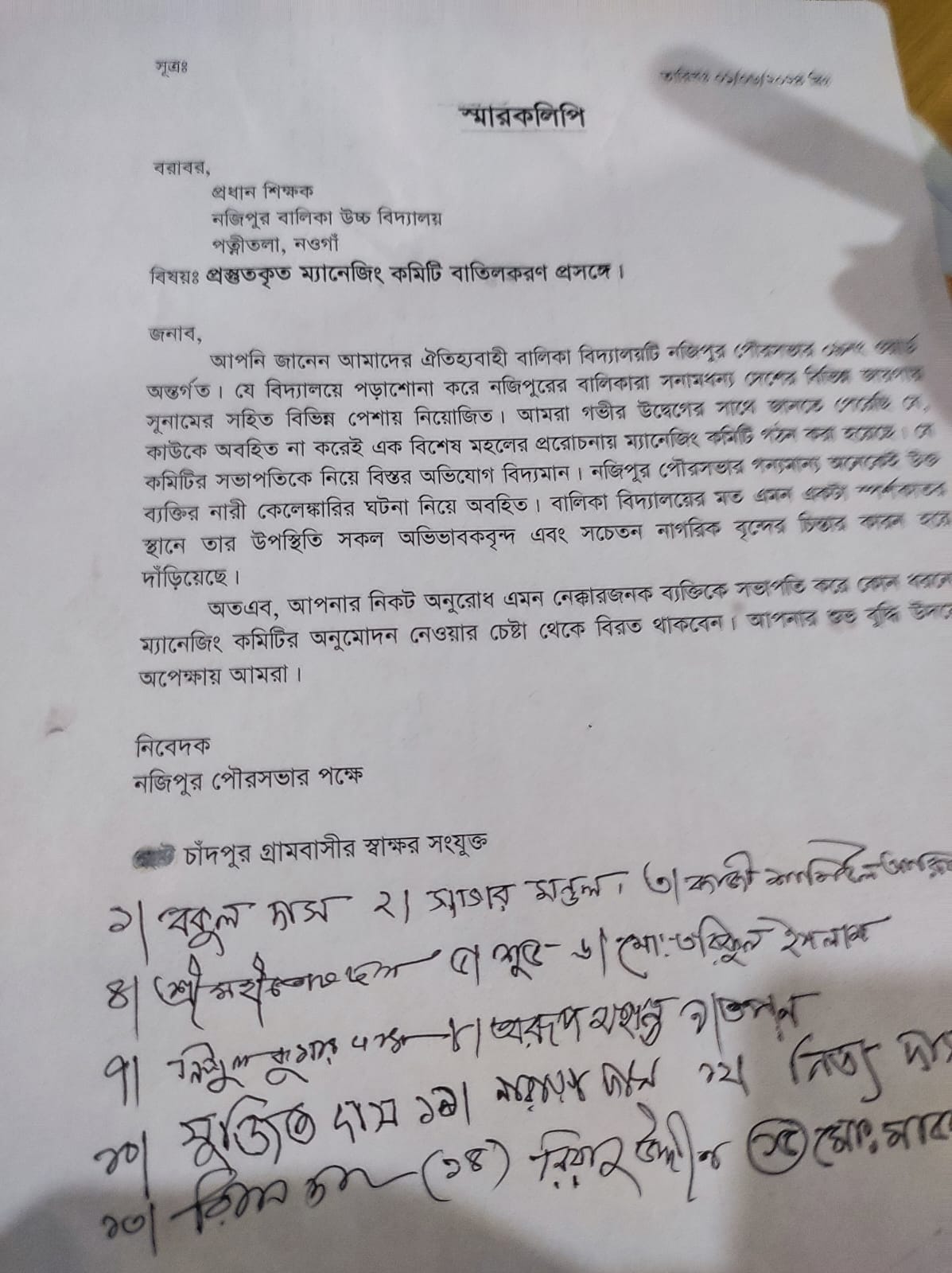 শনিবার ১ জুন প্রধান শিক্ষককে দেওয়া এক স্মারকলিপিতে বলা হয়, নজিপুর ঐতিহ্যবাহী বালিকা বিদ্যালয়ে পড়াশোনা করেই ছাত্রীরা দেশের বিভিন্ন জায়গায় সুনামের সাথে বিভিন্ন পেশায় নিয়োজিত আছেন। আমরা বিভিন্ন অভিযোগের ভিত্তিতে জানতে পেরেছি কাওকে না জানিয়ে একটি বিশেষ মহলের প্ররোচনায় সম্পূর্ণ বেআইনিভাবেনেজিং কমিটি গঠন করা হয় । এই কমিটির সভাপতির বিরুদ্ধে গুরুতর অভিযোগ আছে। নজিরপুর পৌরসভার গন্যমান্য অনেকেই তার বিরুদ্ধে নারী কেলেঙ্কারির ঘটনা সম্পর্কে জানতে পেরেছেন। বালিকা বিদ্যালয়ের মত একটি প্রতিষ্ঠানে তার উপস্থিতি সকল অভিভাবক ও সচেতন নাগরিকবৃন্দের উদ্বেগের কারণ হয়ে দাঁড়িয়েছে।