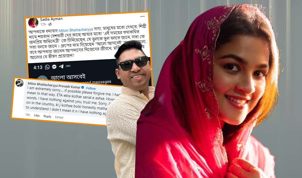 ওই গ্রুপে সাদিয়া আয়মানকে নিয়ে অভিনেতা মিলন ভট্টাচার্যের একটি মন্তব্যের স্ক্রিনশট শেয়ার করেছেন সাদিয়া নিজেই। যেখানে দেখা যায়, সাদিয়া আয়মানকে ‘তথাকথিত জনপ্রিয় অভিনেত্রী’ বলে মন্তব্য করে অরুণা বিশ্বাসকে চিনিয়ে দিচ্ছেন মিলন। বিষয়টি মোটেও ভালোভাবে নেননি এই অভিনেত্রী।