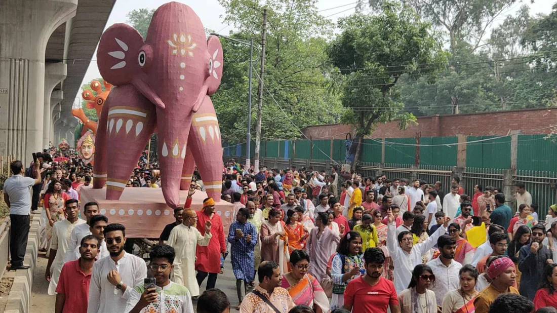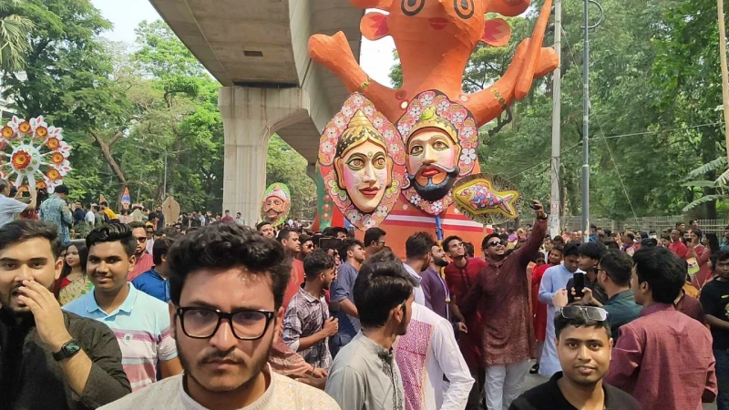 বাঙালির চিরাচরিত সাজে হাজার হাজার উৎসবপ্রেমী মানুষের শাহবাগ থেকে চারুকলা পর্যন্ত সড়কে অবস্থান বলে দেয় নতুন বছরের আগমনী বার্তা।
