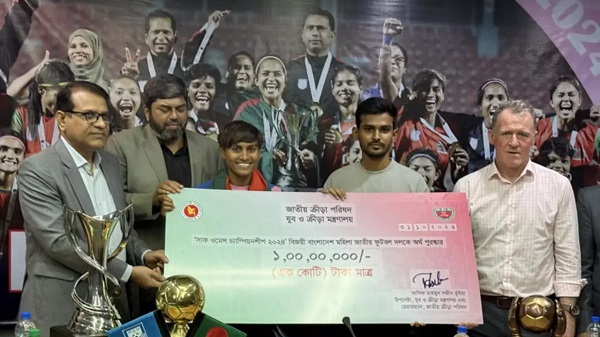 মেয়েদের সাফ চ্যাম্পিয়ন শিরোপা ধরে রেখেছে বাংলাদেশ। নেপালকে হারিয়ে টানা দ্বিতীয়বার ঘরে তুলেছে সাউথ এশিয়ার শ্রেষ্ঠত্বের মুকুট। অবিস্মরণীয় সাফল্যে চ্যাম্পিয়ন মেয়েদের ১ কোটি টাকা অর্থ পুরস্কার দিয়েছে যুব ও ক্রীড়া মন্ত্রণালয়।
