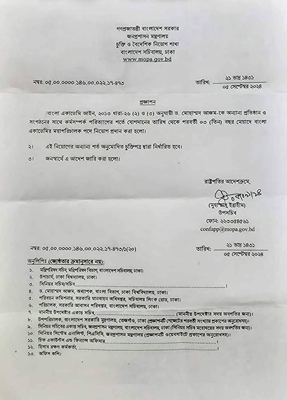 জনপ্রশাসন মন্ত্রণালয়ের নিয়োগ প্রজ্ঞাপনে বলা হয়, বাংলা একাডেমি আইন, ২০১৩ ধারা-২৬ (২) ও (৩) অনুযায়ী ড. মোহাম্মদ আজমকে অন্যান্য প্রতিষ্ঠান ও সংগঠনের সঙ্গে কর্মসম্পর্ক পরিত্যাগের শর্তে যোগদানের তারিখ থেকে পরবর্তী ৩ বছর মেয়াদে বাংলা একাডেমির মহাপরিচালক পদে নিয়োগ প্রধান করা হলো। এই নিয়োগের অন্যান্য শর্ত অনুমোদিত চুক্তিপত্র দ্বারা নির্ধারিত হবে।