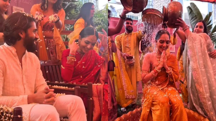শুক্রবার একেবারে দক্ষিণী রীতি অনুযায়ী গায়ে হলুদ সারলেন জুটি। হয়েছে মঙ্গলস্নানও। জুটির বেশ কিছু ছবিও প্রকাশ্যে এসেছে। ছবি নিয়ে তৈরি করা হয়েছে ভিডিওটি। একটি ছবিতে দেখা যায়, পাশাপাশি বসে নিয়ম পালন করছেন শোভিতা ও নাগা। লাল শাড়ি আর সাবেকি গহনা পরেছেন শোভিতা। অন্যদিকে পাজামা-পাঞ্জাবিতে সেজেছেন নাগা চৈতন্য। তাদের চারপাশে পরিবারের সদস্যরা।