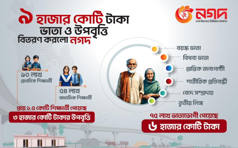 সদ্য সমাপ্ত ২০২৪-২৫ অর্থবছরে শিক্ষা উপবৃত্তি, সামাজিক নিরাপত্তা ভাতা ও অন্যান্য খাত মিলিয়ে ৯ হাজার কোটি টাকার সরকারি সহায়তা বিতরণ সফলভাবে সম্পন্ন করেছে ডাক বিভাগের মোবাইল আর্থিক সেবা নগদ।