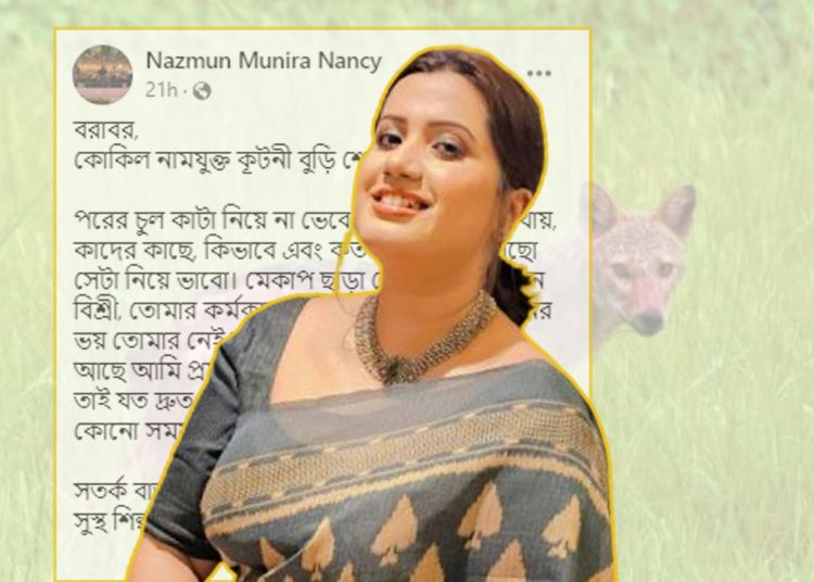 রবিবার বিকেলে তার পোস্টটি সামাজিক যোগাযোগ মাধ্যমে ছড়িয়ে পড়েছে। সেই পোস্টে ন্যান্সি কোনো একজনকে ‘কুটনি বুড়ি’ ও ‘শেয়াল রাণী’সহ আরও বেশ কিছু শব্দ প্রয়োগে গালমন্দ করতে দেখা গেল। যা নিয়ে আলোচনা-সমালোচনা তুঙ্গে!