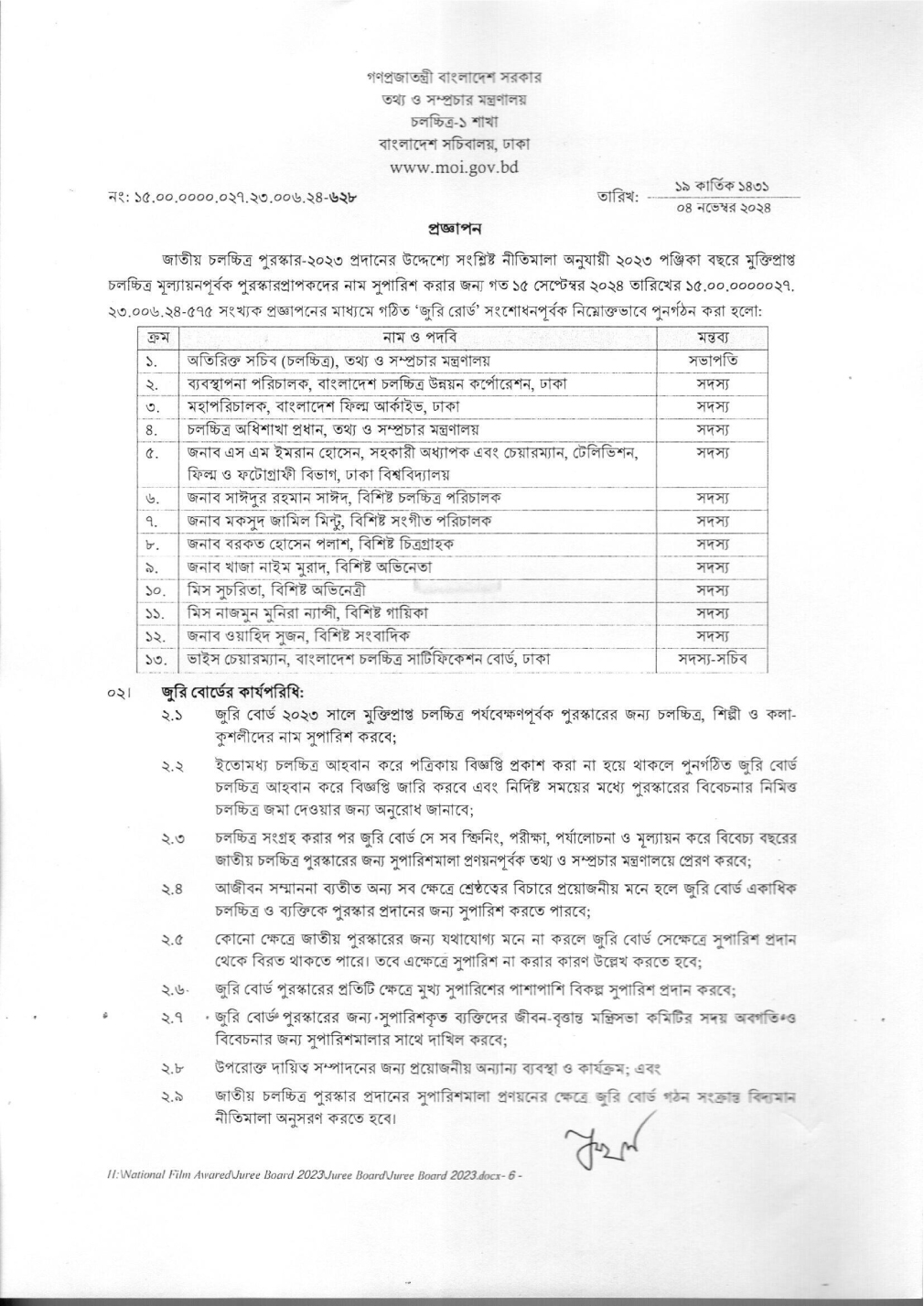 সোমবার (৪ নভেম্বর) তথ্য ও সম্প্রচার মন্ত্রণালয় থেকে প্রকাশিত প্রজ্ঞাপনে ১৩ সদস্যের জুরি বোর্ড গঠনের কথা জানানো হয়। এরমধ্যে ১৫ সেপ্টেম্বর প্রকাশিত প্রজ্ঞাপনে অভিনেতা ইলিয়াস কাঞ্চন, নির্মাতা জাহিদুর রহিম অঞ্জন, সংগীত পরিচালক প্রিন্স মাহমুদ ও অভিনেত্রী অপি করিমের নাম ছিল।