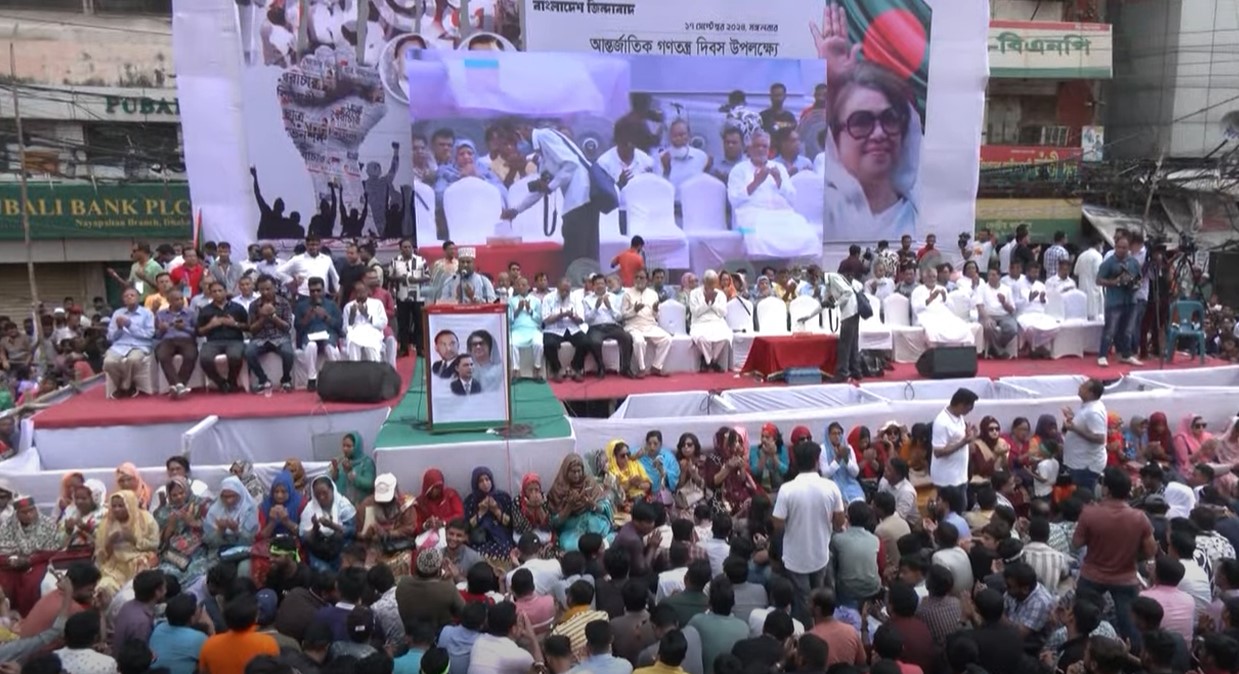 নয়াপল্টনে আন্তর্জাতিক গণতন্ত্র দিবস উপলক্ষে বিএনপির সমাবেশ শুরু হয়েছে। সমাবেশে নেতা-কর্মীদের ঢল নেমেছে। ঢাকার আশপাশের জেলা ও রাজধানীর প্রতিটি ওয়ার্ড ও থানা থেকে মিছিল নিয়ে সমাবেশে এসেছেন বিএনপি এবং এর অঙ্গ-সহযোগী সংগঠনের নেতা-কর্মীরা। স্লোগানে স্লোগানে প্রকম্পিত হচ্ছে পুরো নয়াপল্টন এলাকা।
