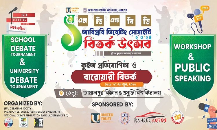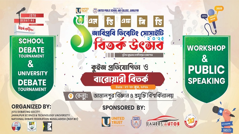 ন্যাশনাল ডিবেট ফেডারেশন অব বাংলাদেশ আগামীকাল ২৭ জুন ও ২৮ জুন আয়োজন করতে যাচ্ছে ‘যুক্তির মুগ্ধতায়, নবদিগন্তের প্রত্যাশায়’ শ্লোগানে ‘ইউনাইটের ট্রাস্ট ১ম এনডিএফ বিডি-জাবিপ্রবি বিতর্ক উৎসব ২০২৫।
