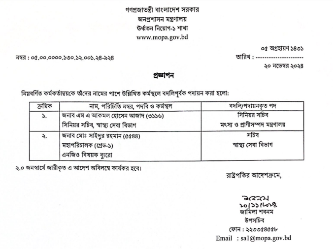 আজ বুধবার ২০ নভেম্বর জনপ্রশাসন মন্ত্রণালয়ের ঊর্ধ্বতন নিয়োগ-১ শাখা থেকে জারি করা প্রজ্ঞাপনে এই কথা জানানো হয়।