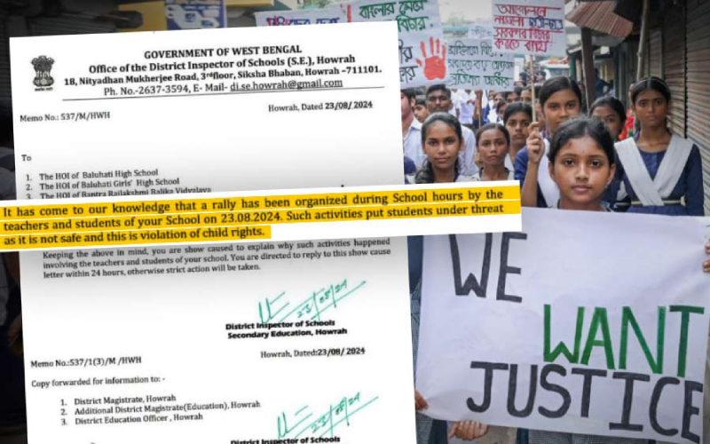 শুক্রবার (২৩ আগস্ট) বিকালে আরজি কর মেডিক্যাল কলেজে চিকিৎসক ধর্ষণ এবং খুনের প্রতিবাদে বেশ কয়েকটি মিছিল হয়েছে হাওড়ার। মিছিলে স্কুলের শিক্ষার্থীরা অংশ নেয়ার পর এই নোটিশ আসে।