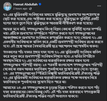 পোস্টে তিনি আরও বলেন, গতকালের পাঁচ দফার প্রথম দফা হলো ৭২-এর মুজিববাদী সংবিধান বাতিল করে নতুন করে জনগণপন্থী সংবিধান লিখতে হবে। এ দাবির বিপরীতে অবস্থান নিয়ে ৭২-এর সংবিধানের ধারাবাহিকতা রক্ষার বয়ান হলো গণঅভ্যুত্থান পরিপন্থী বয়ান। ২৪ পরবর্তী বাংলাদেশে গণঅভ্যুত্থান পরিপন্থী যেকোনো বয়ান আবার ফ্যাসিবাদ পুনর্বাসনের সুযোগ করে দেবে। সুতরাং ২৪ এর গণঅভ্যুত্থানের স্পিরিটে বিশ্বাসী ফ্যাসিবাদবিরোধী ঐক্যবদ্ধ শক্তি ৭২-এর মুজিববাদী সংবিধানের ধারাবাহিকতা রক্ষার পক্ষে অবস্থান নিয়ে ফ্যাসিবাদকে পুনর্বাসনের সুযোগ দিতে পারে না।