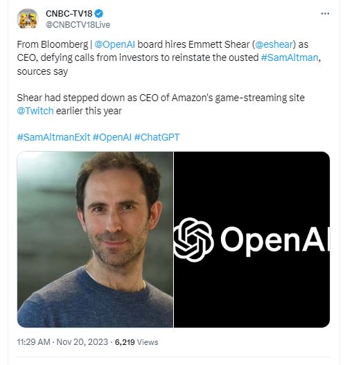 আজ (২০ নভেম্বর) সোমবার মার্কিন যুক্তরাষ্ট্রের সংবাদ মাধ্যম সিএনবিসি একটি এক্স (টুইটার) পোস্টের মাধ্যমে জানিয়েছে, ওপেন এআই এর সিইও পদে নিয়োগ পেয়েছেন এমমেট শিয়ার। চলতি বছরের শুরুতেই অ্যামাজনের গেম-স্ট্রিমিং সাইটের সিইও পদ থেকে পদত্যাগ করেছেন তিনি।